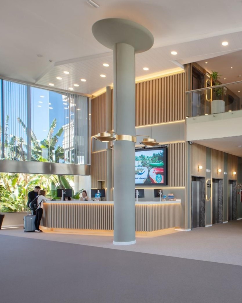 Para el hall, el reto era convertir unas columnas de gran altura en protagonistas sin desentonar. Nuestra propuesta: